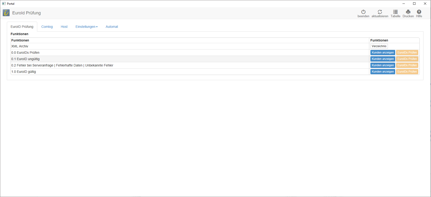 Die Prüfung kann im Reiter EuroID Prüfung selbst gestarted werden oder über den Automaten regelmäßig überprüft werden. Zudem bietet das Portal Einstellmöglichkeiten für die automatische Prüfung und das Sperren oder Melden bei der Belegerstellung.